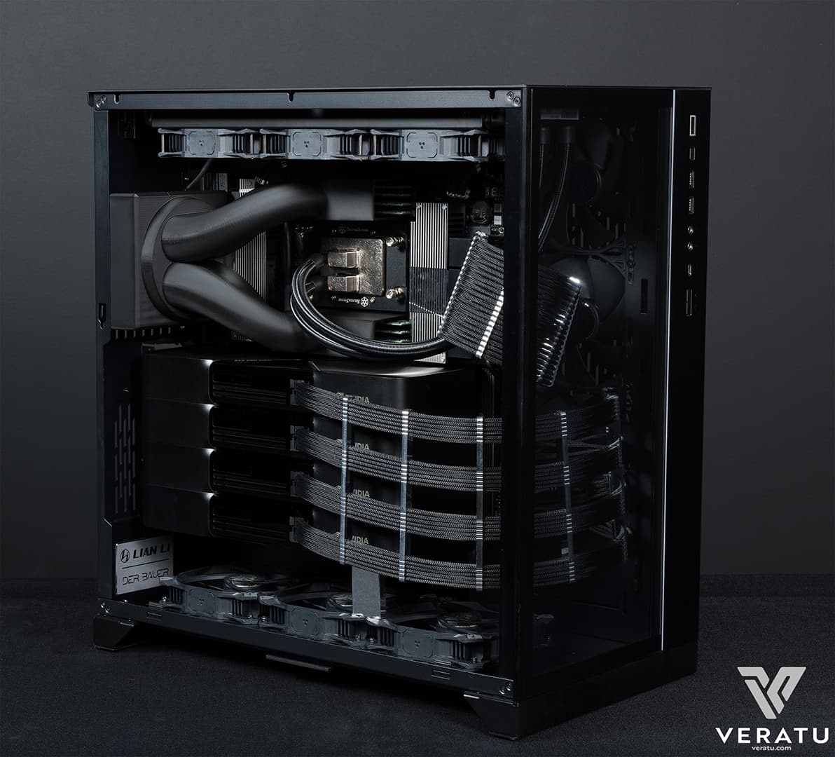 Thought you guys might like to see another one I finished up for a good friend of mine. He had some really tough space requirements and we had to trade off a bit of performance for 2 of the GPUs for thermal reasons but it still puts out very impressive numbers, far better than I was expecting with the RTX flow through chimney design.
