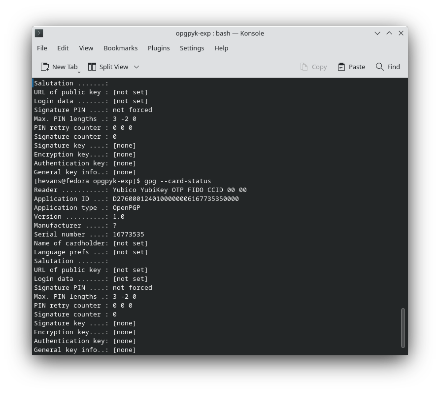 To check the PIN/Admin PIN reset status, enter the GPG command: gpg --card-status. If you receive the response “gpg --card-status” fails, terminate gpg-agent and gpg-connect-agent processes, then try again, or you can reboot.